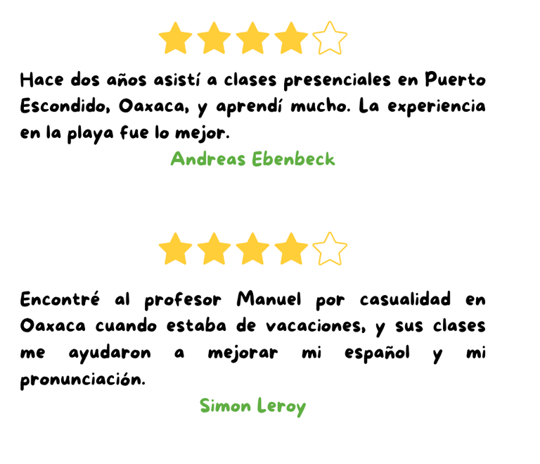 Spanish with Manu se fundó en 2023 como una escuela física de español en la costa de Oaxaca, México. Con el tiempo, hicimos la transición a un modelo online para ofrecer paquetes de español a personas de todo el mundo.